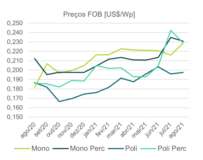 Compared with the results in July 2021, the average FOB price of PV components in August 2021 decreased 0.33%, and the total percentage increased 19.2% since December 2020. Greener predicts that component prices will rise sharply in the second half of the year and may last until 2022.